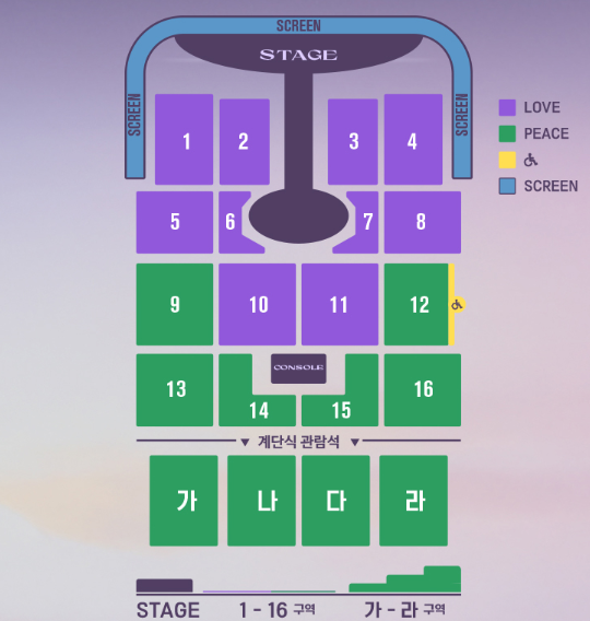 또한 PEACE석은 LOVE석보다 약간 거리가 있지만, 스크린이 크고 시야 방해가 적어 장시간 공연을 감상하기에 적합합니다. 13~16구역은 측면 시야를 가지지만, 무대 조명 연출을 감상하기에는 탁월합니다.